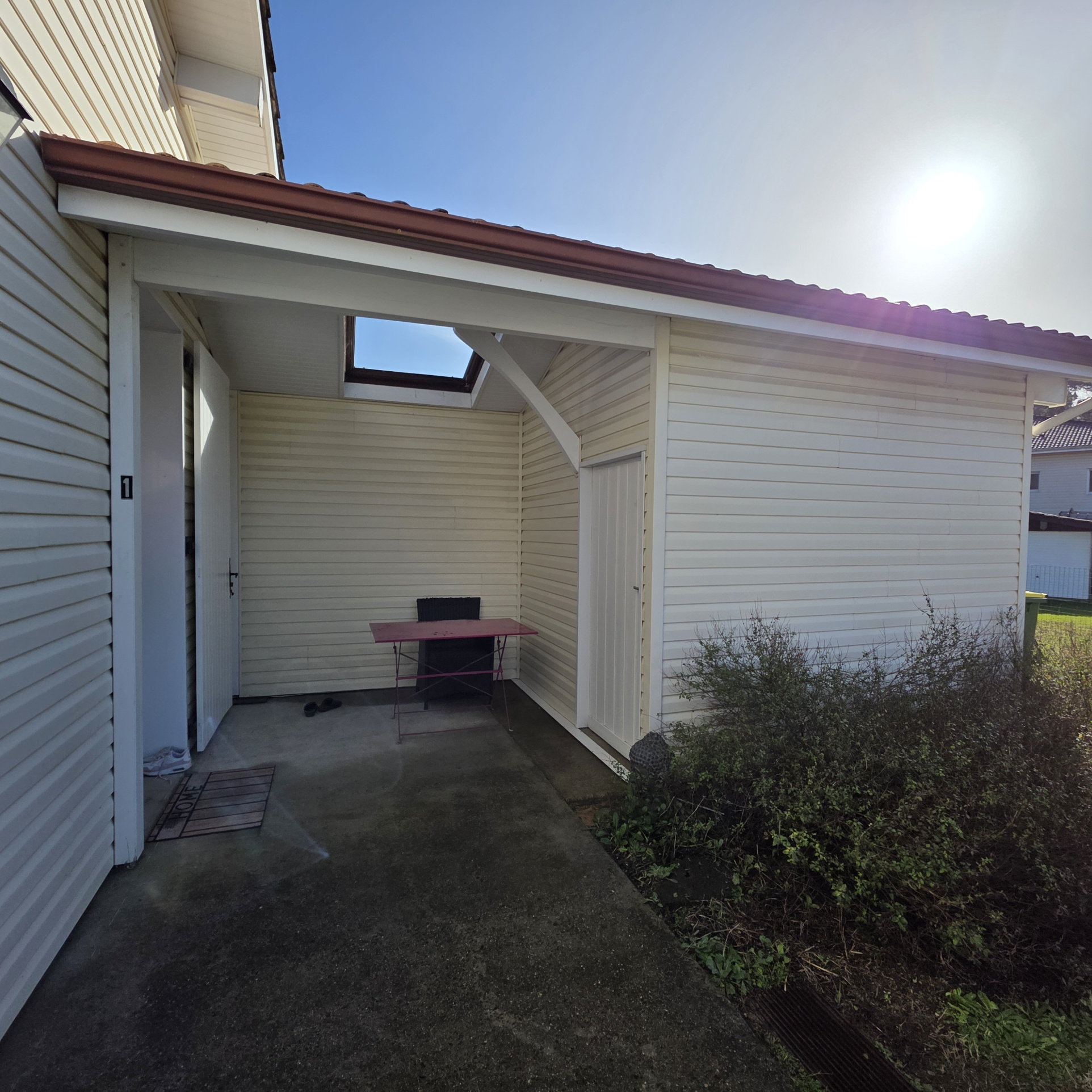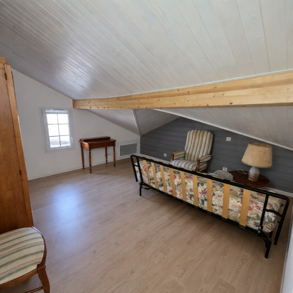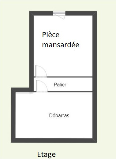 A l’étage : Une pièce mansardée et un débarras. Cabanon de jardin attenant à la maison. Terrasse en béton brute couverte et un jardinet.