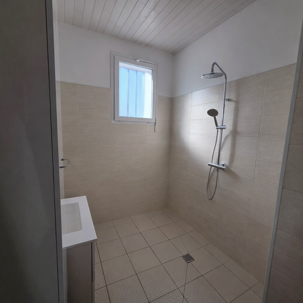 Au rez-de-chaussée une cuisine (meuble bloc évier, hotte), un salon qui peut servir de chambre, une salle d’eau avec un WC (douche italienne, un meuble une vasque avec un miroir et une colonne de rangement), un placard.